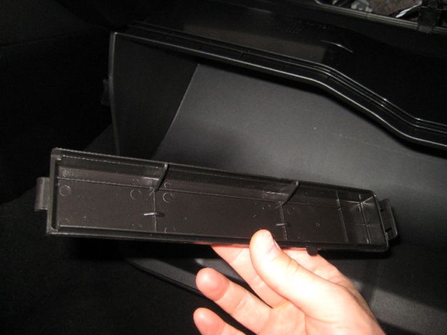 - Демонтировать бардачок. Для этого необходимо сжать края, и снять фиксатор снизу.