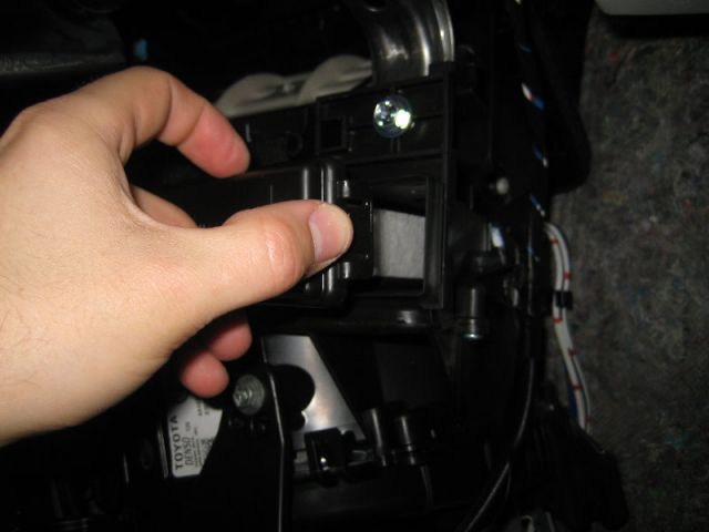 4.В глубине отсека под бардачком, будет расположена небольших размеров пластиковая коробка, в которой и находится салонный фильтр тойоты. Чтоб добраться непосредственно до фильтра, необходимо снять пластмассовую крышку с коробки, для этого нужно сжать фиксирующие язычки.