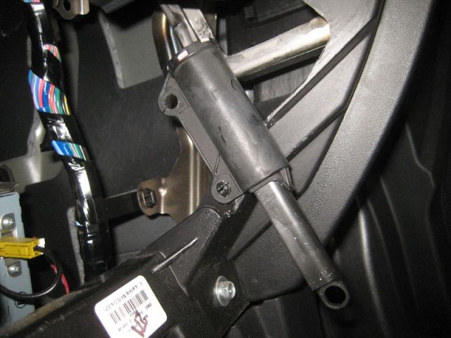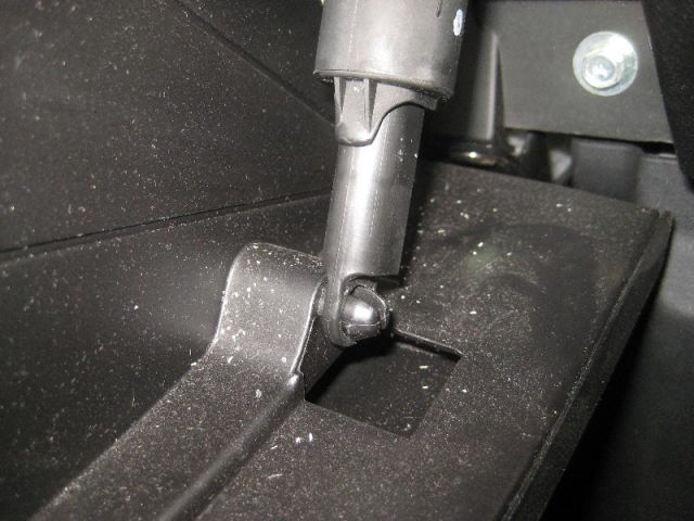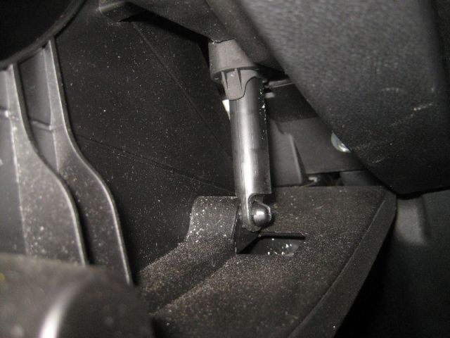 - Освободить ограничитель крышки «бардачка», находящийся с левой стороны. Для этого нажимают на левую боковину крышки и тянут ее на себя. Затем отсоединяют поршень амортизатора, который удерживает крышку и правый ограничитель. При этом крышка должна упасть вперед и вниз «до упора».