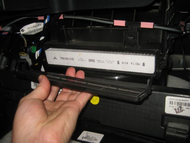 Салонный фильтр кроссовера Mitsubishi ASX располагается за ящиком для перчаток (бардачком).