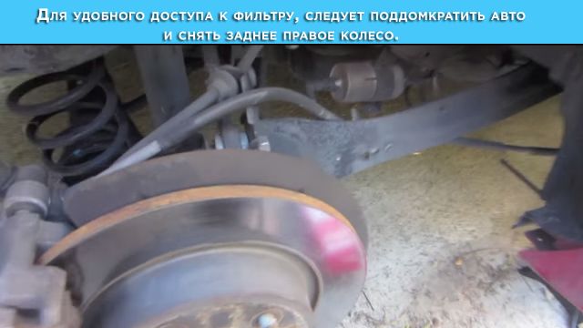 Сначала нужно снять пластиковую защиту топливного фильтра, выкрутив пару болтов. Затем поддомкратить и снять заднее колесо, чтобы был удобный доступ к фильтру. Далее необходимо отсоединить топливные шланги и открутить болты крепления топливного фильтра.
