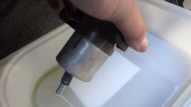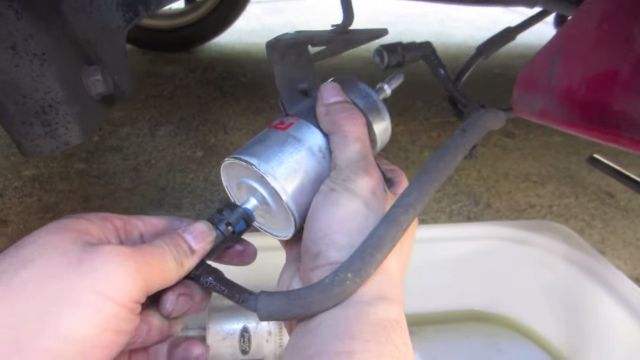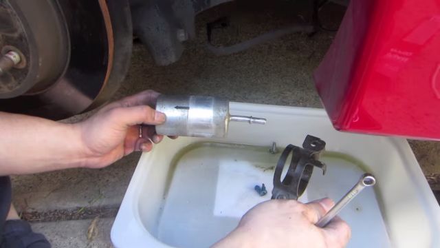 После этого можно снять старый фильтр топлива, слить остатки топлива и снять крепеж. Затем установить крепеж на новый фильтр и произвести обратную установку топливного фильтра.