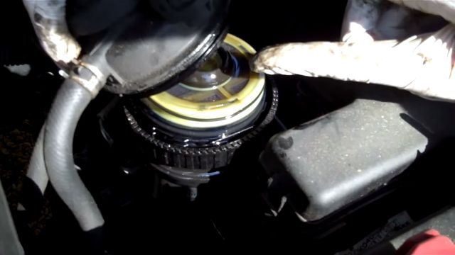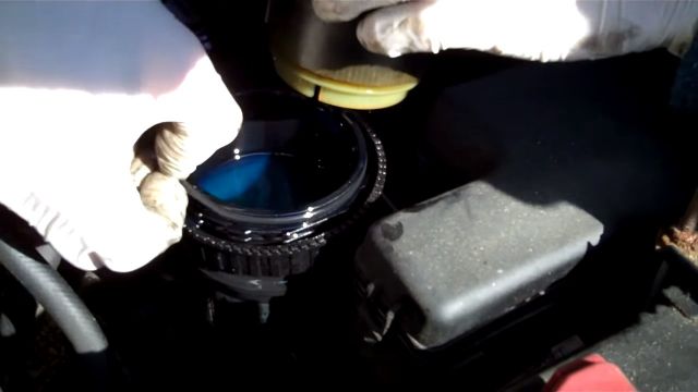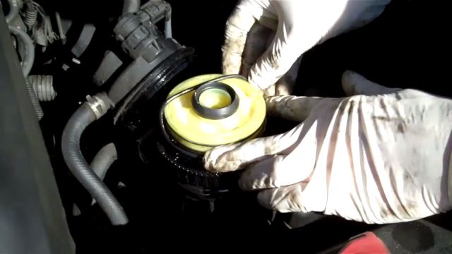 Заменив фильтрующий элемент и резинки, следует установить крышку и закрутить стяжную гайку. Затем накачать топливо в фильтр с помощью резинового «грибка» на верху корпуса. Когда его станет трудно нажимать, топливо заполнит фильтр.