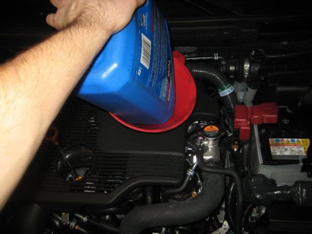 - Залить в двигатель нужное количество свежего масла (при вставленном щупе).