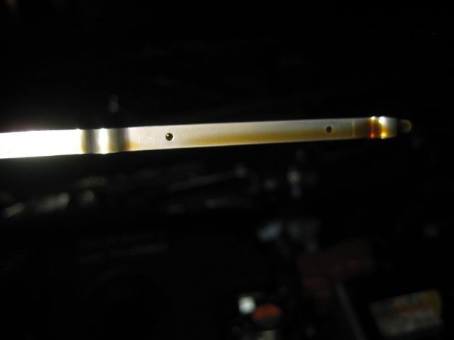 Проверить уровень по щупу — он должен быть посредине или возле верхней метки.