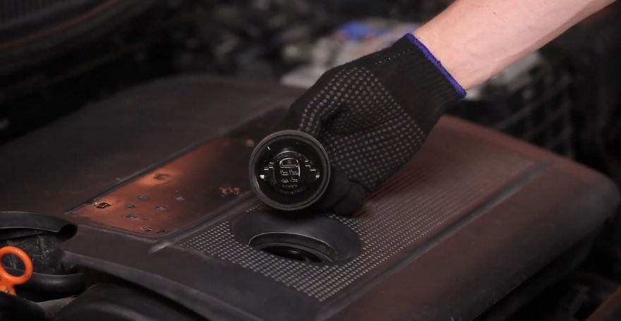 Открутить от руки, не забывая, что масло прогретое и может обжечь.