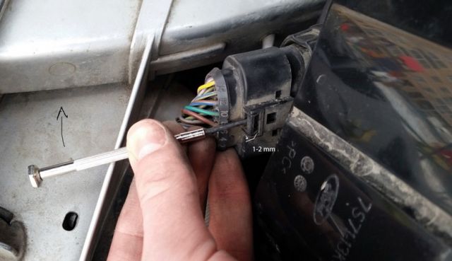 2. Отжав отвёрткой пружинный фиксатор фонаря освещения номерного знака…
