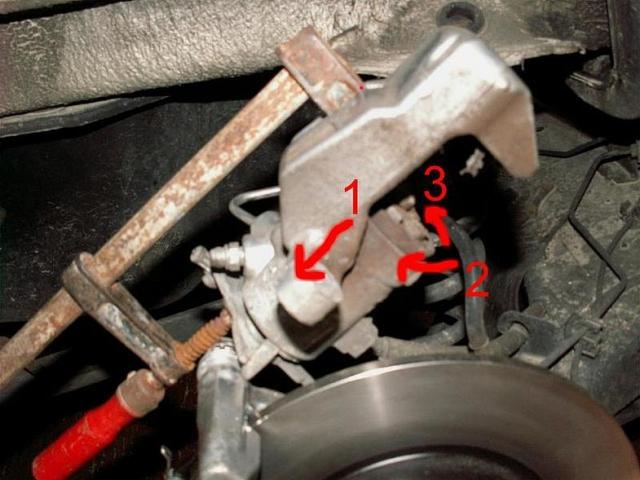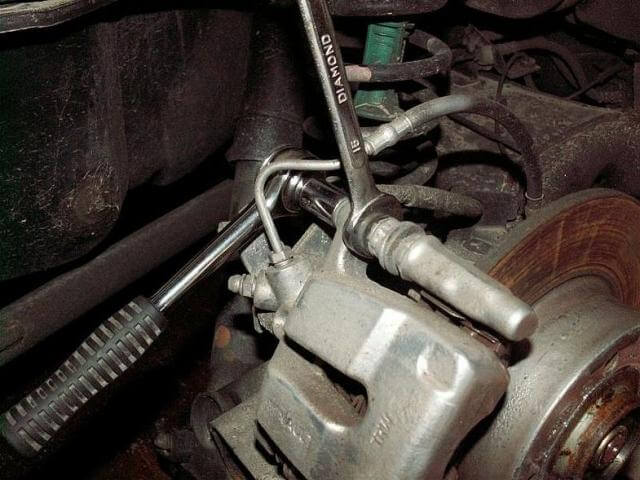 Перед разборкой тормозов откройте крышку бачка тормозной жидкости и шприцем доведите ее уровень до минимума — при вдавливании поршней в суппорта уровень значительно возрастет.