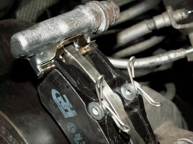 Извлеките старые колодки и пружинные пластины, после чего металлической щеткой очистите скобу и cуппорт. Проверьте, нет ли следов подтекания тормозной жидкости через манжету поршня.
