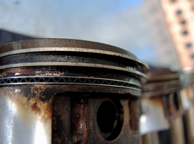 Далее откручиваем болты ГБЦ и снимаем голову, увиденное нас ничем впринципе не удивило, увидели вообщем то что и ожидали, по состоянию поршней и колец судите сами: