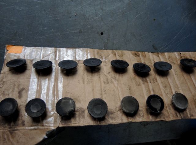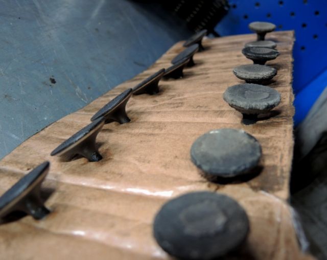 Далее вынимаем по одному поршню, снимаем старые кольца, ими же и счищаем весь нагар с поршней, вместе с этим брызгая Карб. Клинером.