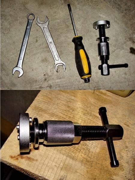 Необходимые инструменты — отвертка, два ключа — один на 13 и один на 17, а также понадобится специальное приспособление для поршня. Подробнее — смотрите фотоотчет.