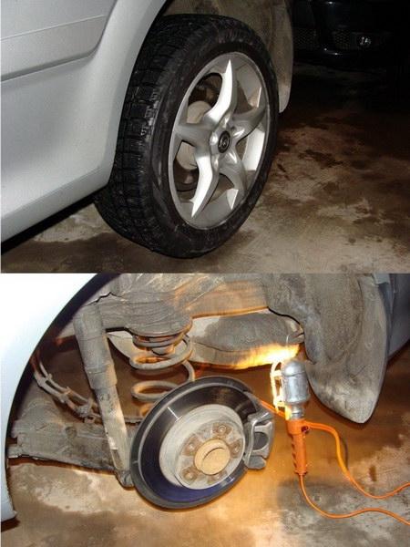 Ставим автомобиль а домкрат, снимаем колесо и чистим все от грязи щеткой по металлу.