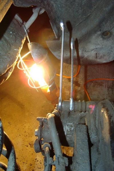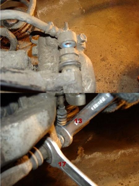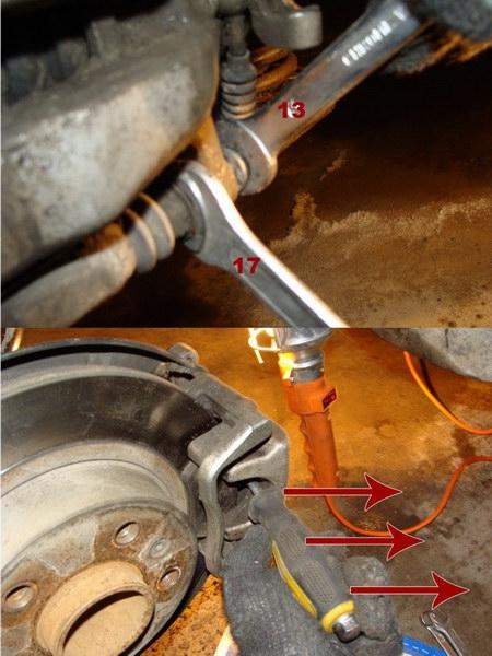 Поднимаем машину на домкрате, срываем колёсные болты и демонтируем колесо. Откручиваем направляющие используя для этого два ключа на 17 и 13: