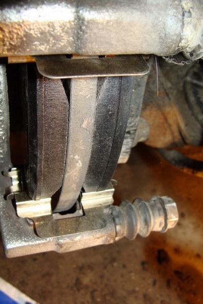 Очищаем отвёрткой или щёткой по металлу посадочные места колодок на скобе суппорта. Устанавливаем новые колодки, в некоторых случаях необходимо будет немного подточить их боковинки, в нашем случае 0.5 мм с каждой стороны: