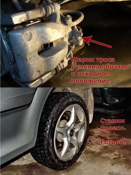 Обратите внимание, колодки на задних тормозах меняются аналогично передним за исключением одного момента. Придется снимать тросик стояночного тормоза. В остальном, передние и задние колодки меняются по одному и тому же принципу.