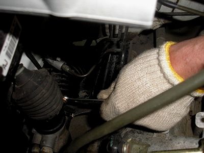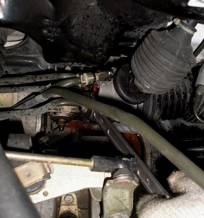 • На подрамнике кузова районе правого лонжерона снимаем крепление трубки гидроусилителя и выворачиваем оба штуцера на рулевой рейке. Запаситесь пустой емкостью, для слива остатков жидкости из системы гидроусилителя.