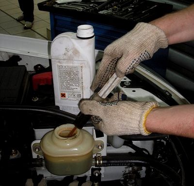 — Пускаем двигатель. Проверяем уровень жидкости в бачке при работе двигателя на средних оборотах. При необходимости доливаем ее до отметки MIN.