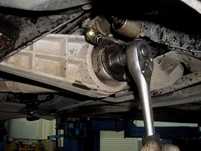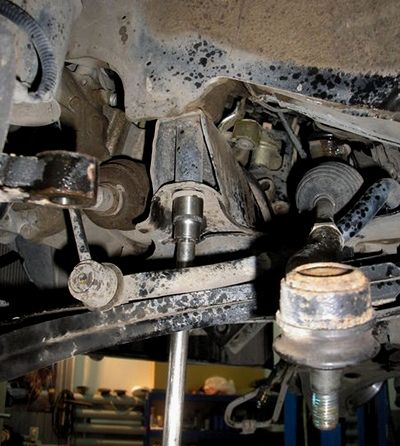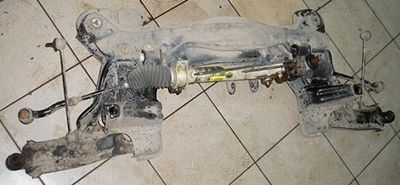 • Затем необходимо частично разобрать подвеску: снять стабилизатор, шаровые опоры, наконечники рулевых тяг, опоры двигателя, болты приемной трубы на катализаторе, после чего снять подрамник.