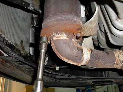 Аккуратно открутите три гайки, которыми крепится фланец приемной трубы к катализатору, а также поддерживающий крепежный кронштейн к блоку двигателя.