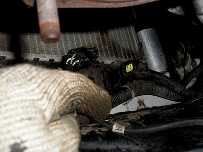 На рамке под радиатором отключите разъем лямбда-зонда. В удобном для себя месте подвесьте всю приемную трубу глушителя.