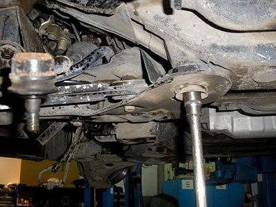 Все, что осталось сделать это — демонтировать подрамник, сделать это можно посредством откручивания крепежных болтов, но не спешите выкручивать болты полностью, оставьте несколько витков резьбы.