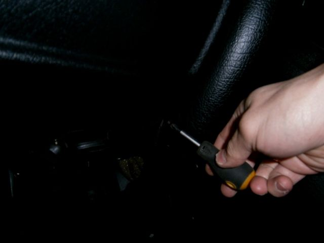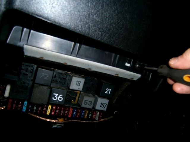 За крышкой блока предохранителей, расположен ещё один винт. Откручиваем его снимаем большой кусок пластика под рулём, для упрощённого доступа.