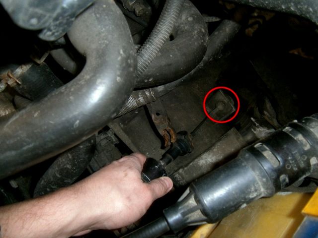 Ослабляем затяжку болтов крепления ШРУСов к дифференциалу КПП. Требуется большое усилие, также доступ будет затруднен. Пока помощник держит тормоз, срываем болты.