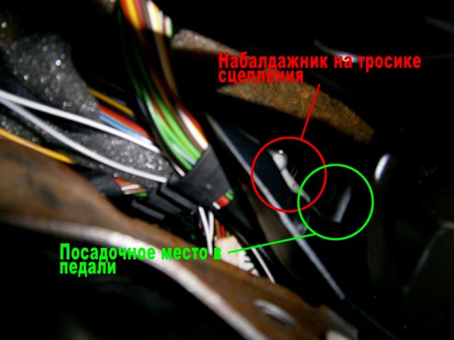 Надеваем тросик на своё место. Но тут возникнет трудность… нам нужно что бы набалдажник на конце тросика попал в паз на педали. Поскольку руками туда не добраться, воспользуемся крючком из спицы. А чтобы он защелкнулся в пазу педали попросим друга чтобы он дёрнул тросик из подкапотного пространства. Затем снимаем чеку и жмем пару раз педальку сцепления.