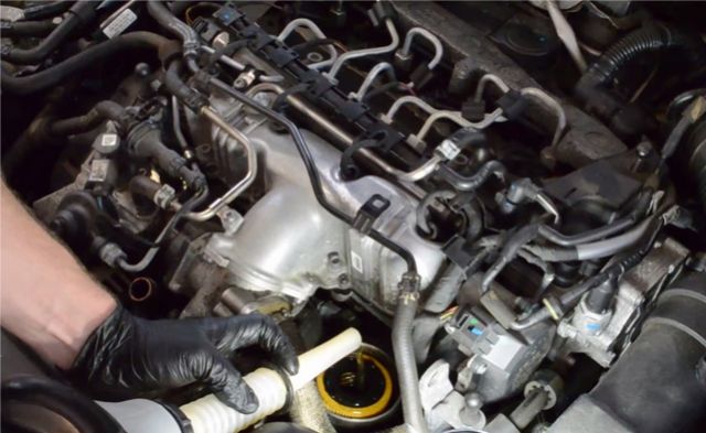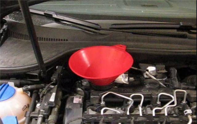 Далее надо установить воронку в заливную горловину и залить новое масло. Не обязательно лить все сразу.