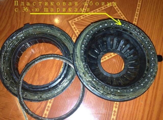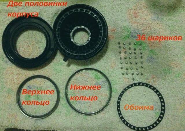 Приступаем к сборке опорного подшипника стойки амортизатора. В нижнюю часть подшипника укладываем большое направляющее кольцо по которому бегают шарики.