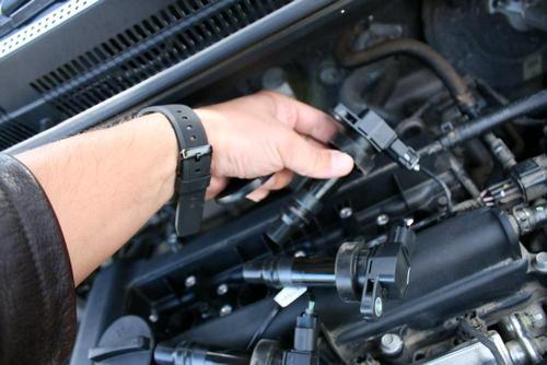 Сначала мастер демонтирует крышку двигателя, для чего откручивает 4 болта торцевым ключом «на 10». Удалив крышку, получает доступ к высоковольтным катушкам, которые тоже необходимо открутить, после чего немного сдергивает их со своего места. Полностью удаляет весь блок, состоящий из четырех катушек.