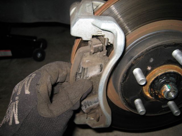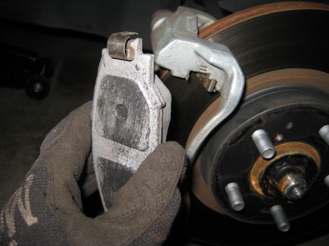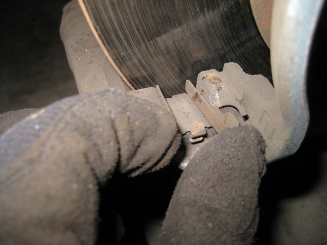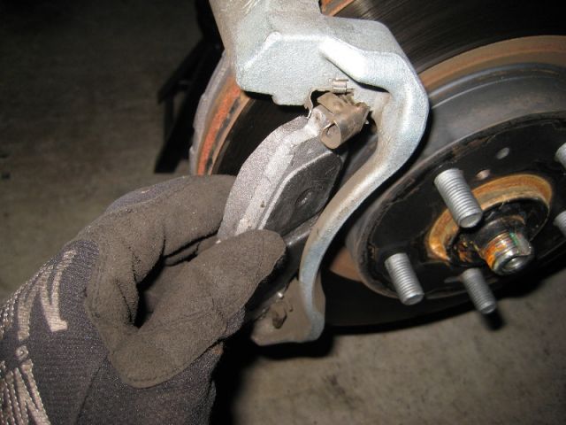 Теперь можно снять старые колодки. На некоторых тормозных колодках есть небольшая металлическая скоба, которая служит «датчиком» износа колодок. Когда они изнашиваются до определенной степени, скоба начинает тереть о металл, сигнализируя о замене раздражающим скрежетом.