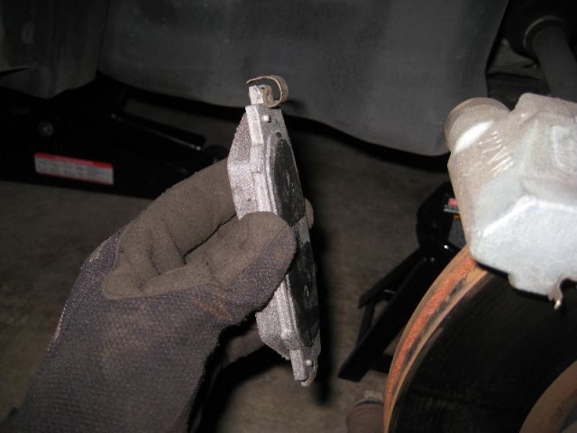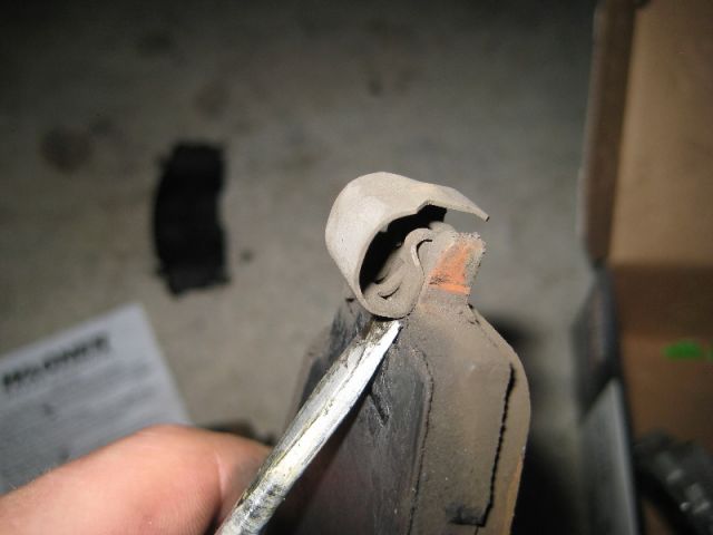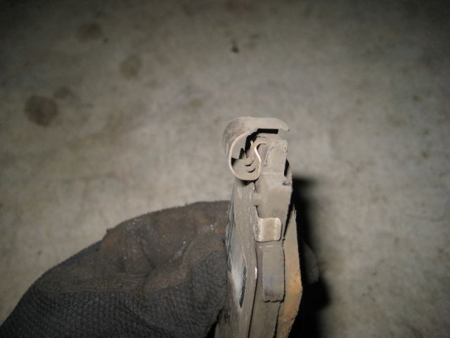 Старая колодка с металлическим «датчиком износа». Когда колодки изнашиваются до определенной степени, он начинает тереть о металл, сигнализируя своим скрежетом, что колодки пора менять.