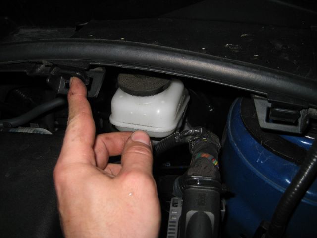 Сжать две клипсы, которые удерживают панель, закрывающую доступ к бачку тормозной жидкости.