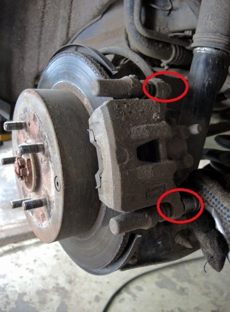 После нужно убрать в сторону суппорт. Для этого откручиваем тормозные направляющие (пальцы).