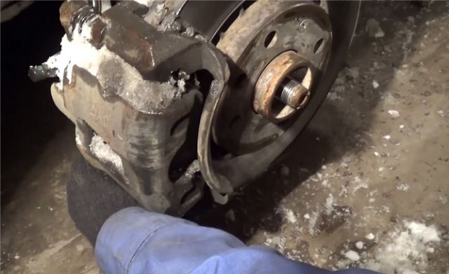 Снятый тормозной суппорт. Лучше его подвесить или что-нибудь подложить, чтобы он не болтался на шланге.
