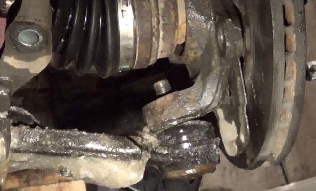 6. Далее необходимо отсоединить нижний рычаг подвески от поворотного кулака. Эта операция была подробно рассмотрена в сообщении о замене шарового шарнира.