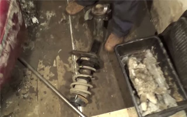 Снимаем переднюю амортизационную стойку с автомобиля. Порядок снятия стойки детально описан в статье Замена верхней опоры передней амортизационной стойки на автомобилях Daewoo Lanos, Daewoo Nexia, Daewoo Sens, Chevrolet Lanos (делаем всё в таком же порядке, только не трогаем крепёжную гайку верхней опоры к штоку амортизационной стойки). Думаю, нет, необходимости повторяться.