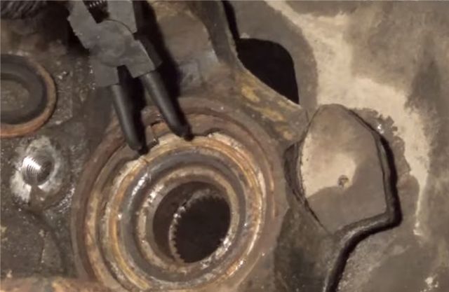 - Воспользуйтесь универсальным съемником, после чего спрессуйте со ступицы кольцо, которое расположено внутри подшипника.