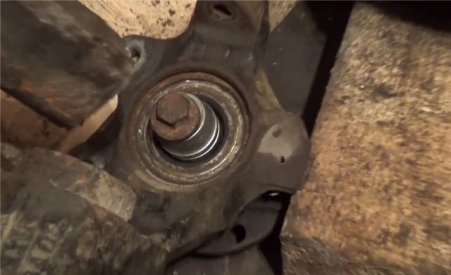 …и съемником запрессовываем ее, опираясь с внутренней стороны поворотного кулака болтом через шайбу на внутреннее кольцо подшипника.
