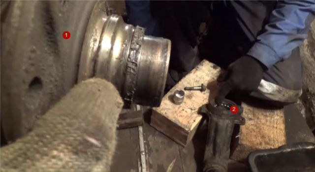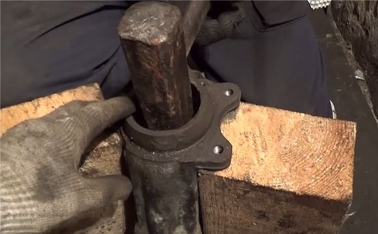 Итак, после того как стойка оказалась у вас в руках, необходимо зажать её в тисках и выбить ступицу молотком, используя оправку подходящего диаметра.