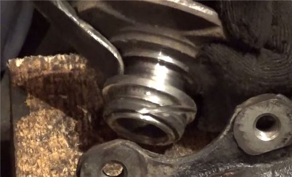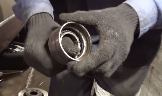 5.Снимите ступицу. Скорее всего, на ступице останется наружная половина внутреннего кольца подшипника.