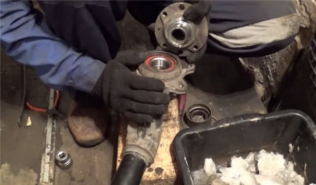- Установите съемник с новым ступичным подшипником на кулак поворотный, для того чтобы осуществить запрессовку можно использовать наружную обойму от снятого старого подшипника.