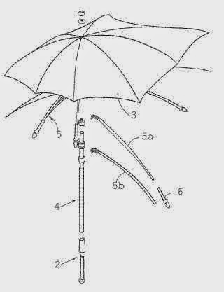 Когда зонт находится в сложенном состоянии, в рукоятке под кнопкой (1) одновременно удерживаются: телескопический шток (2) в сложенном виде и якорь (8) в гильзе (9). Внутри штока в натянутом состоянии находится нить, один конец которой прикреплен к якорю, а второй через валик (11) расположенный в коронке (6) закреплен к бегунку (12).